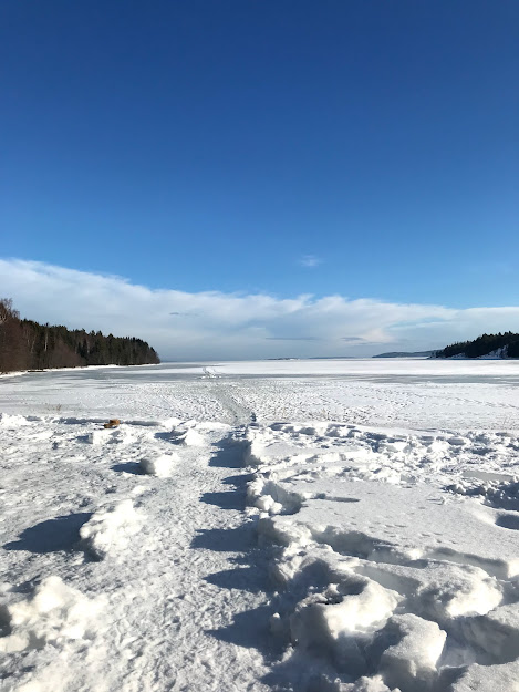 När vi kommer lite uppåt i skogen är det stundtals lite isigt och snö kvar på stigen, men det är fullt framkomligt. Det ser inte ut att vara många som trampat i snön på stigen. Det är ganska tydligt att vi är ensamma här.